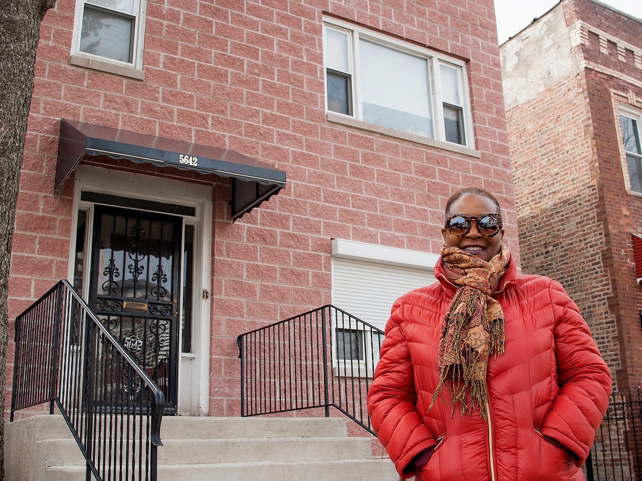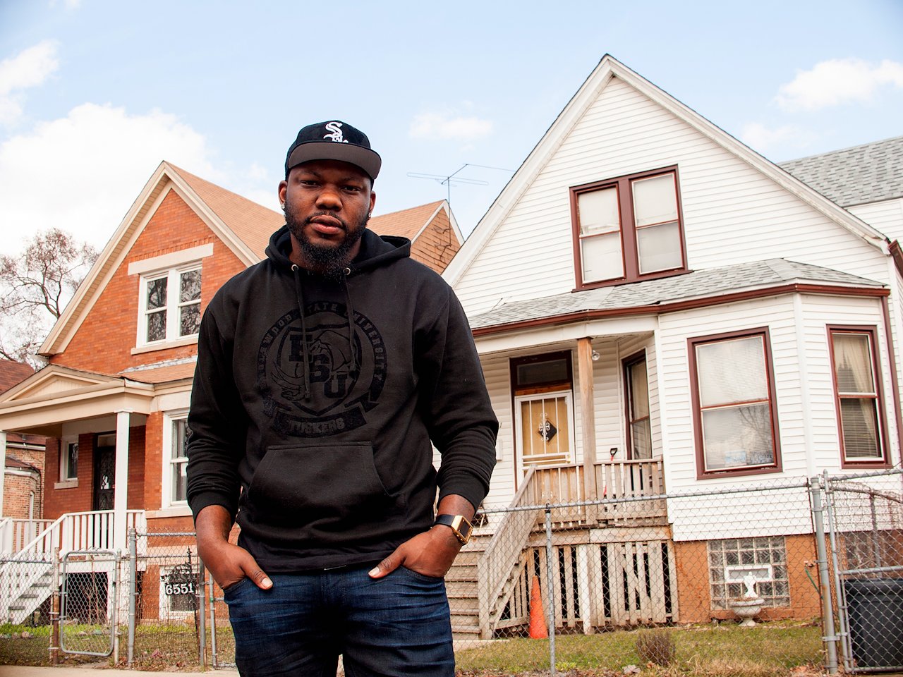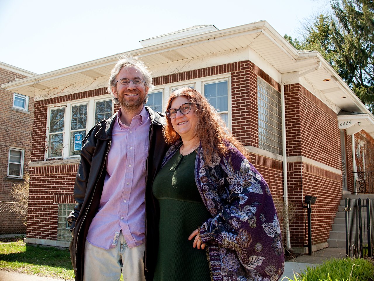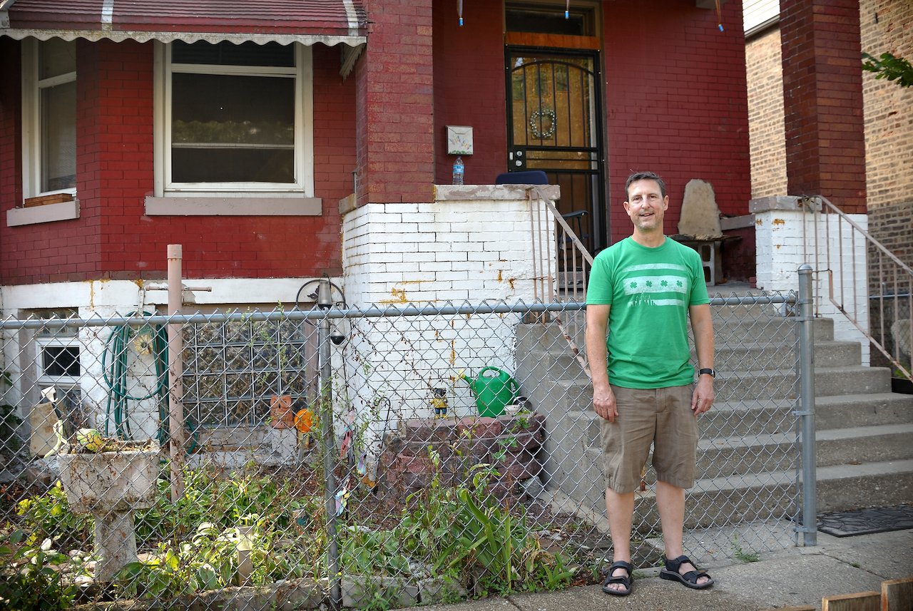 North Side, Edgewater neighborhood resident, Wade, in front of South Side resident, Nanette’s home in Englewood.