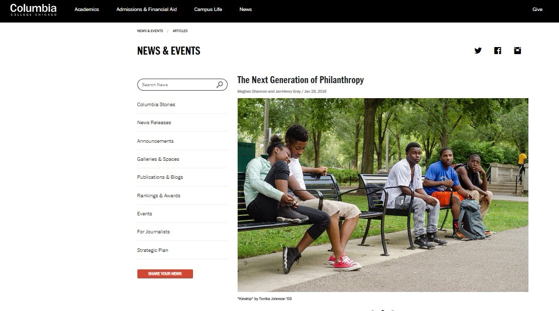 Tonika Johnson partnered with Columbia College’s Development and Alumni Relations, to establish the Tonika Johnson Scholarship for Photography, becoming one of the youngest alumni to create a scholarship for Columbia students. Click the following link to read full article: https://www.colum.edu/news-and-events/articles/2019/the-next-generation-of-philanthropy.html?utm_source=THIS+WEEK+AT+COLUMBIA+NEWSLETTER&utm_campaign=30cb830c15-TWAC_12_04_2018_COPY_01&utm_medium=email&utm_term=0_143d6d778b-30cb830c15-103817845#.XGCVE9JKjIX .